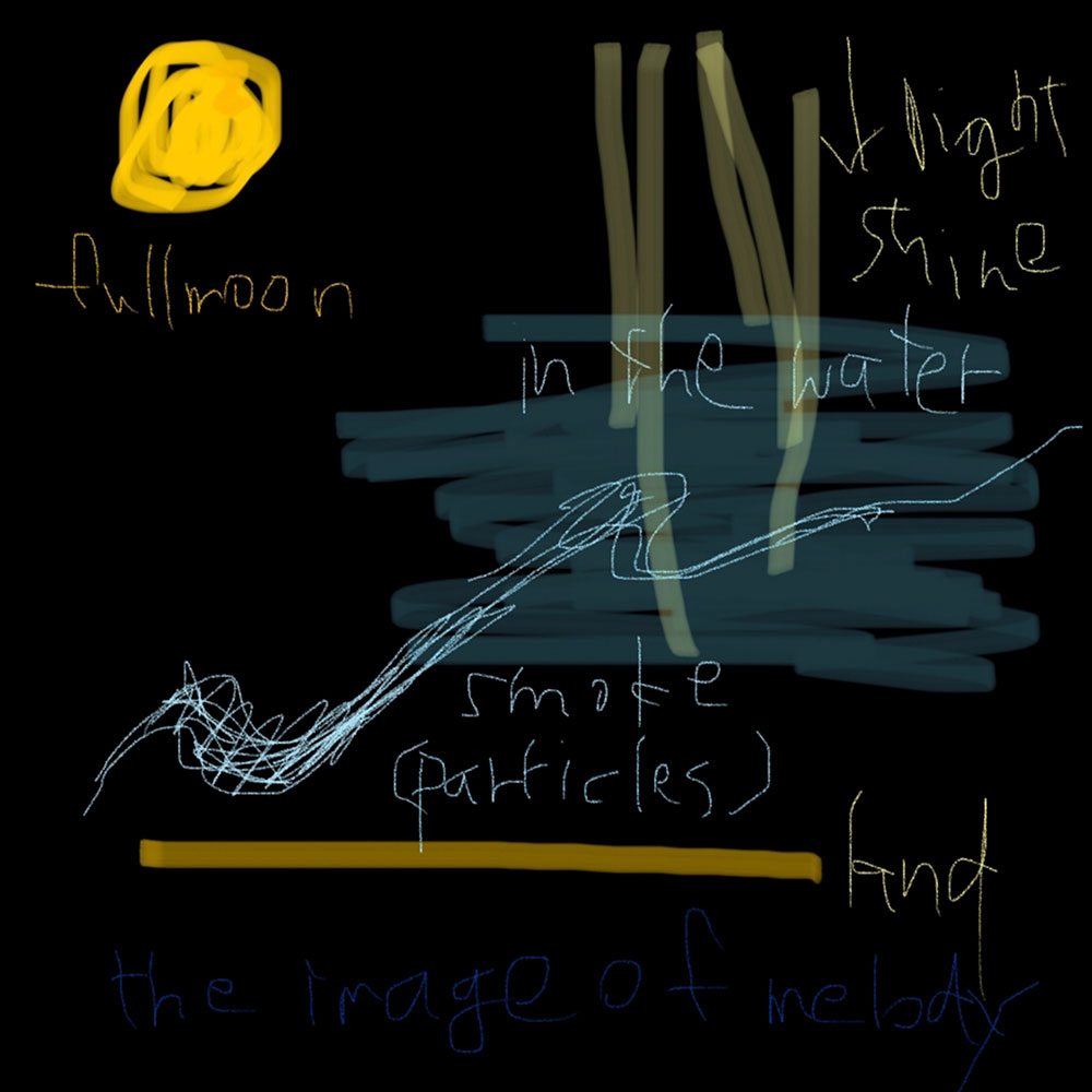 「煙のような形を成した自由度の高い細かな粒子の集まりが、密度を変えながら地を厳かに這ったり、水中をただよったり、素早く宙を進んだり、ときに人間の血に侵入する。水中は、時が経つにつれ次第に月光由来の光で満ちてゆく」様子