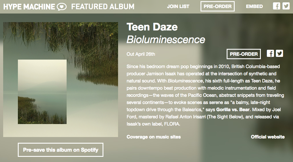 【NEWS】Teen Daze 4/26リリースのアルバム『Bioluminescence』全曲試聴がアグリゲーション・サイトHYPE MACHINEにて開始