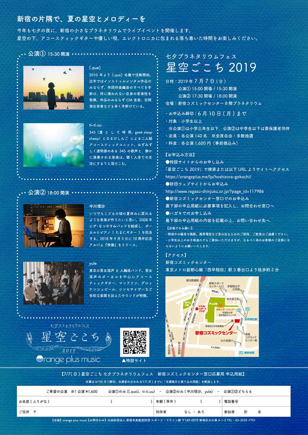 【NEWS】イベント情報:七夕に開催されるプラネタリウムフェス 『星空ごこち』に[.que]、ti-ti.uu、中川理沙、yuleが出演