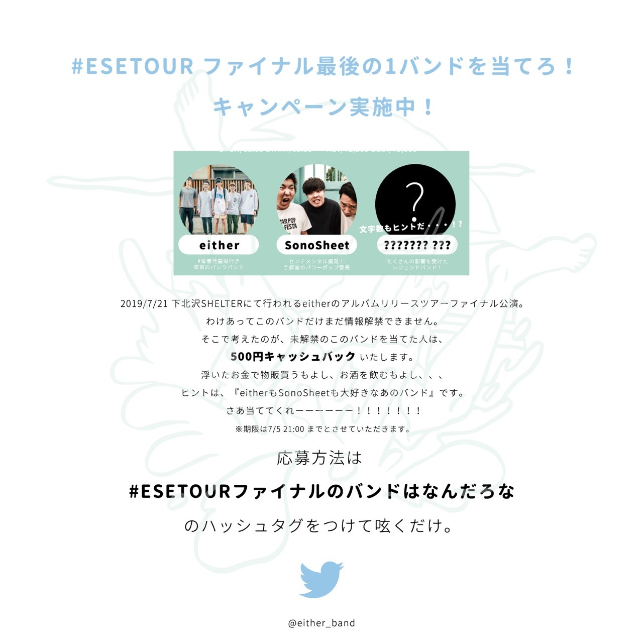 応募方法は「#ESETOURファイナルのバンドはなんだろな」のハッシュタグをつけてTwitterでつぶやくだけ。