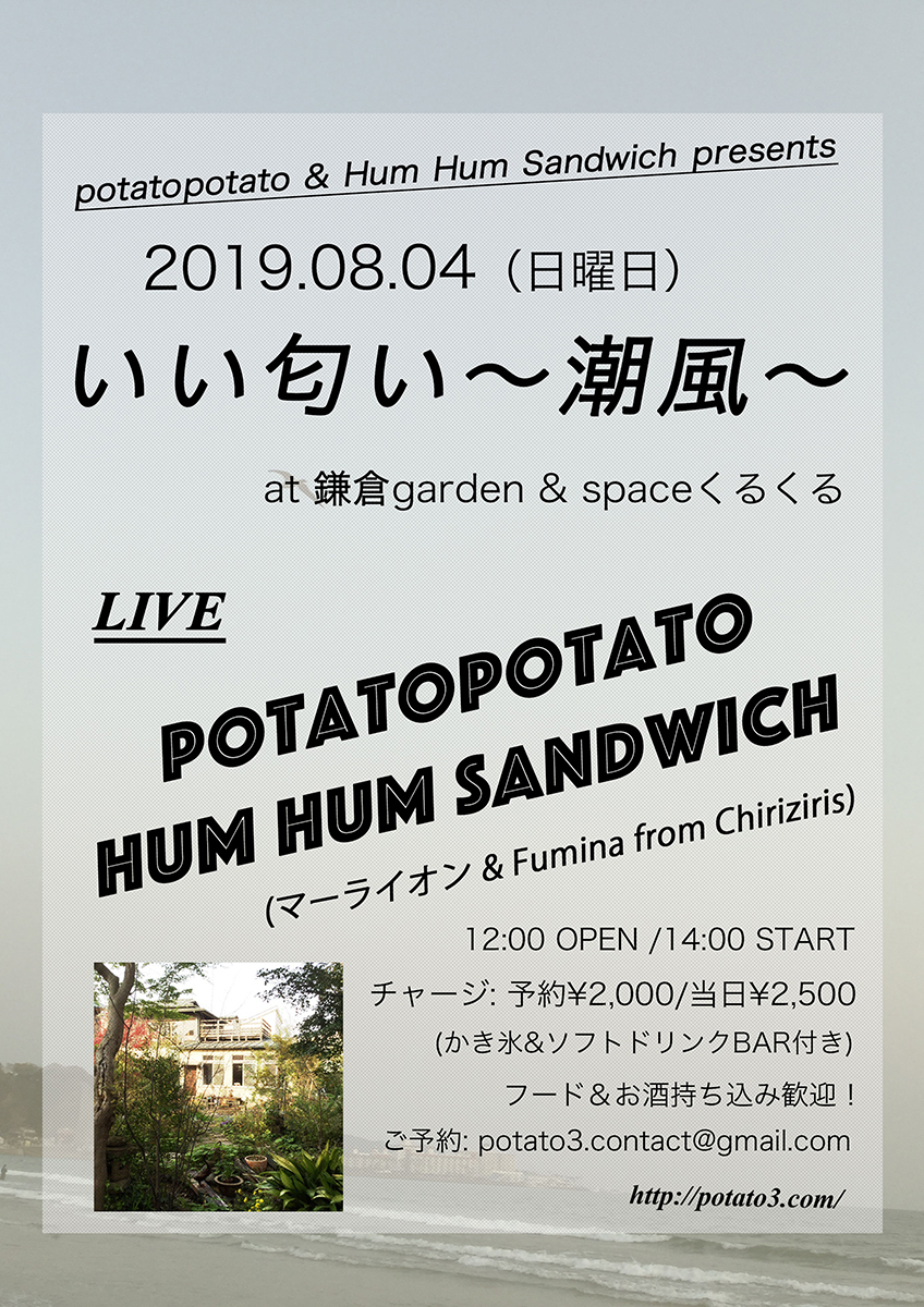【NEWS】イベント情報:Hum Hum Sandwichとpotatopotatoによる自主企画『いい匂い ~潮風~』8/4(日)に鎌倉garden & spaceくるくるにて開催。来場者には新録コンピレーションも