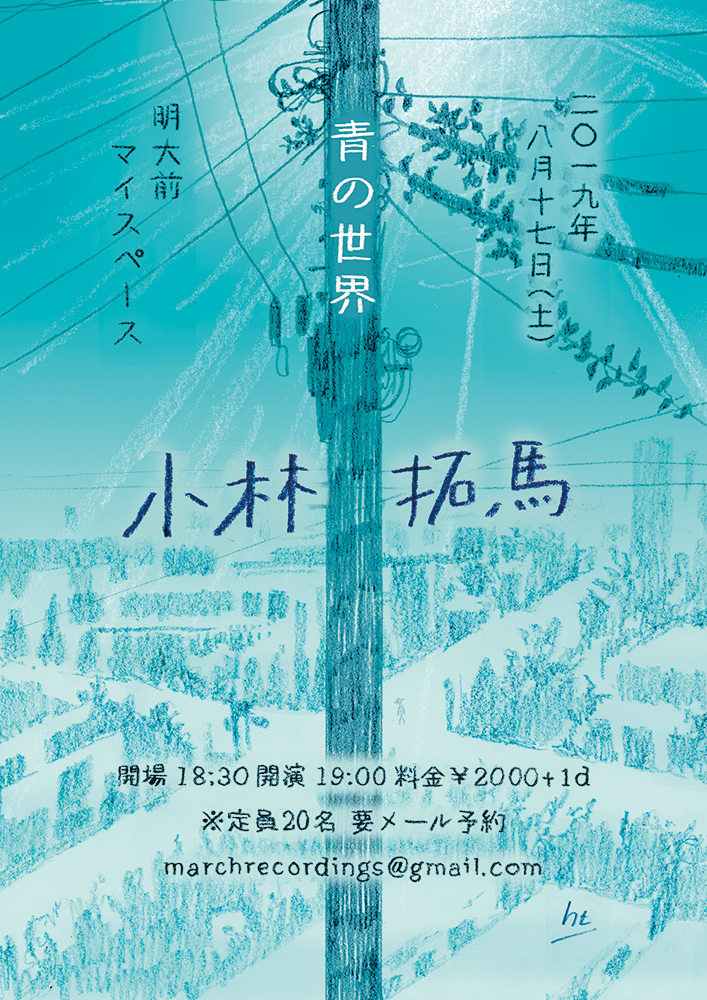 小林拓馬(Conti、far-off land、道産子アナルX、ISHII NARUTO hold’em BAND)による弾き語りイベント『青の世界』の第6夜が8/17(土)に明大前マイスペースにて開催。
