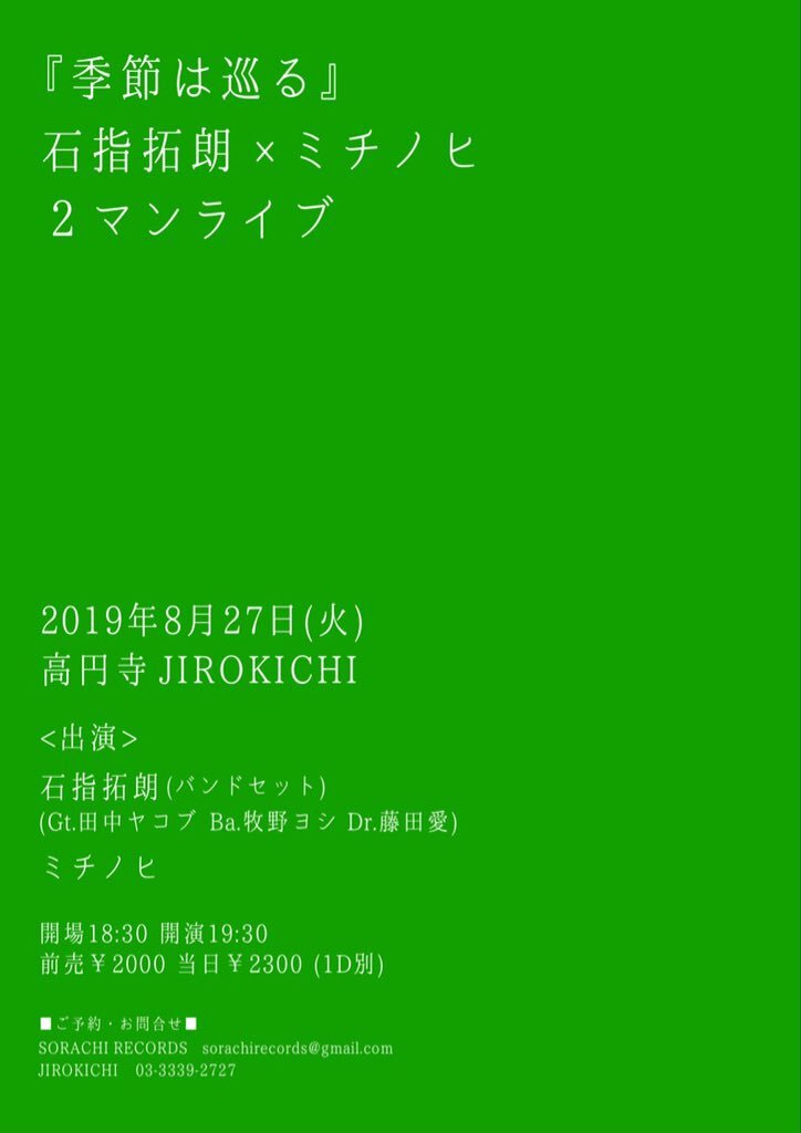 【NEWS】イベント情報:石指拓朗とミチノヒによるツーマンイベント『季節は巡る』8/27(火)に高円寺JIROKICHIにて開催