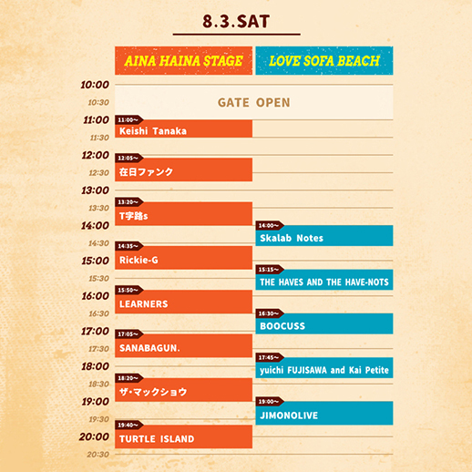 BOOCUSS / THE HAVES AND THE HAVE-NOTS / Keishi Tanaka / JIMONOLIVE / LEARNERS / ザ・マックショウ / Rickie-G / SANABAGUN. / Skalab Notes / T字路s / TURTLE ISLAND / yuichi FUJISAWA and Kai Petite / 在日ファンク