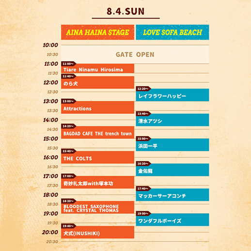 Attractions / BAGDAD CAFE THE trench town / BLOODEST SAXOPHONE feat. CRYSTAL THOMAS / THE COLTS / 浜田一平 / 犬式(INUSHIKI) / 金佑龍 / 奇妙礼太郎with塚本功 / レイフラワーハッピー / マッカーサーアコンチ / のら犬 / 清水アツシ / Tiare Ninamu Hiroshima / ワンダフルボーイズ