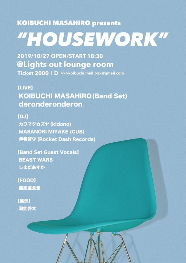 さらに、今週末10/27(日)には水戸のLights out Recordsの多目的スペースlounge roomにてKOIBUCHIの主催イベント『HOUSEWORK』も開催。