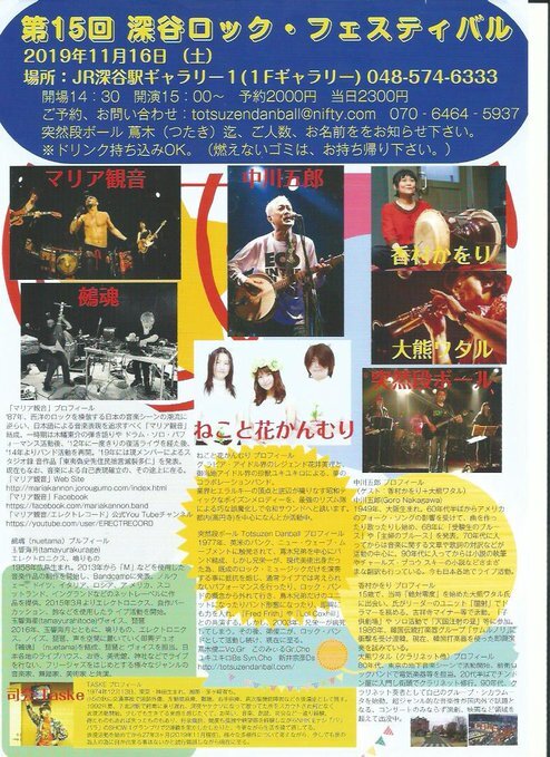 ACT:鵺魂 / 玉響海月 / ねこと花かんむり / 中川五郎(ゲスト:香村かをり+大熊ワタル) / 突然段ボール / マリア観音(木幡東介/平野勇/伊藤明子/a_kira)