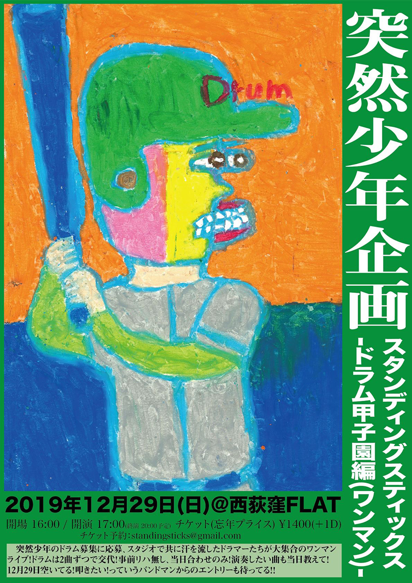 突然少年による企画『スタンディングスティックス-ドラム甲子園編(ワンマン)-』が12/29に西荻窪のLive House FLATにて開催される。