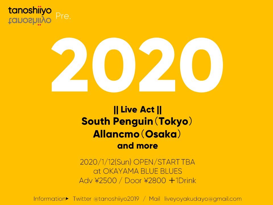 1/12(日)は岡山 BLUE BLUESにてtanoshiiyoの企画に出演する。