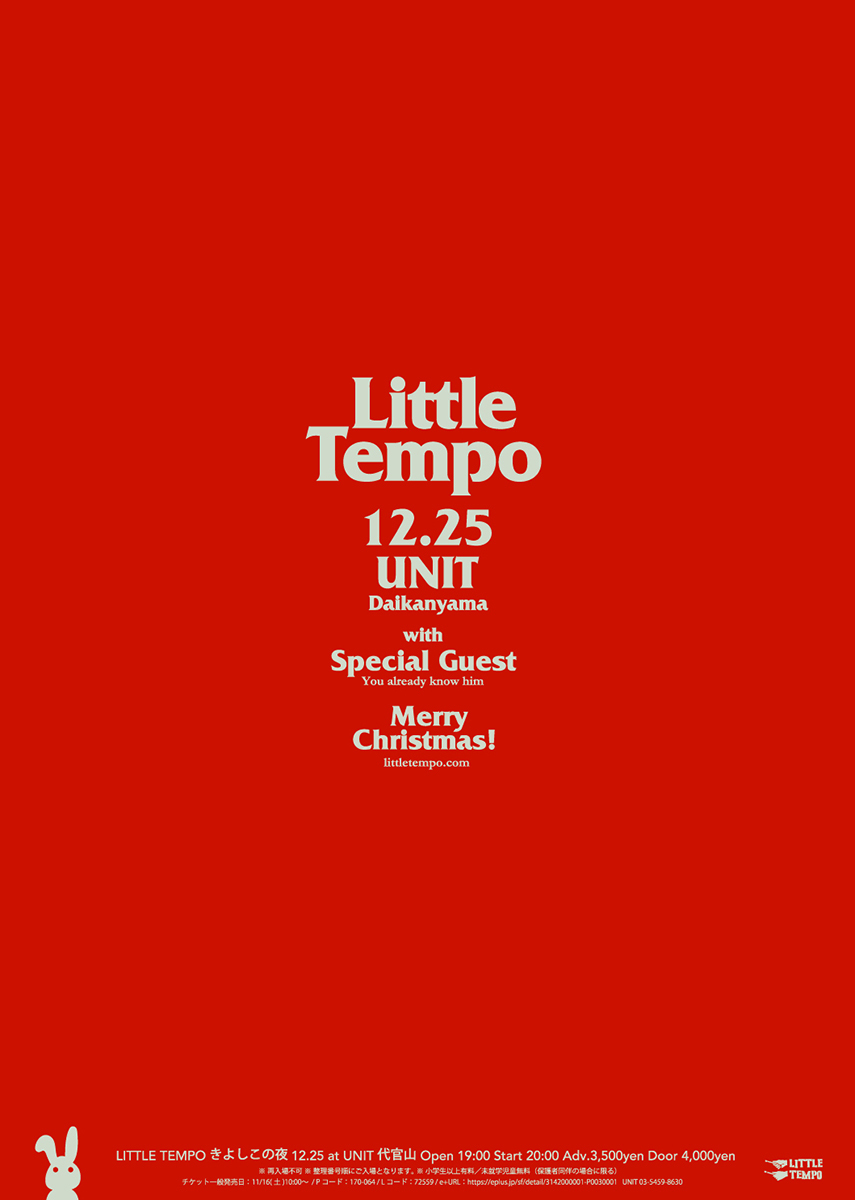 毎年恒例のLITTLE TEMPOによるクリスマス・ライブ『LITTLE TEMPO きよしこの夜』が12/25(水)に代官山UNITにて開催される。