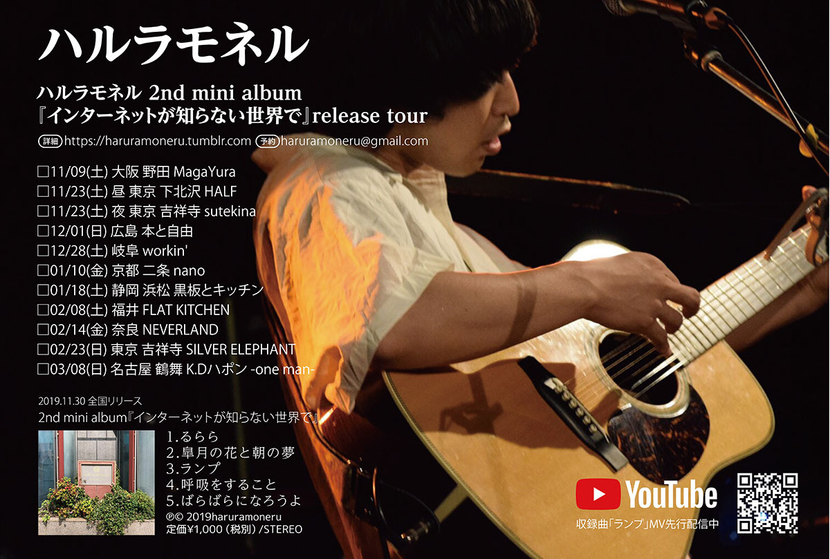 岐阜在住、名古屋を拠点として活動するシンガー・ソングライターのハルラモネルは、本日11/30に2ndミニアルバム『インターネットが知らない世界で』の全国流通を開始。
