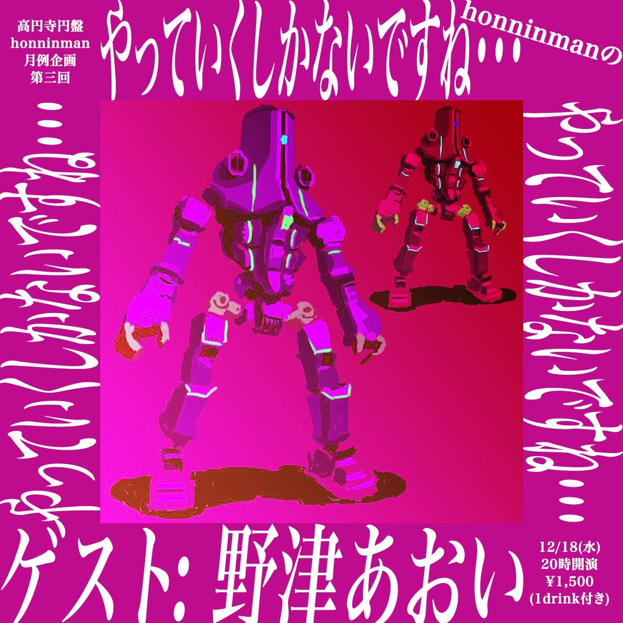 解体ザダン壊としても知られる東京のhonninmanは12/18(水)に高円寺円盤で開催されるhonninman月例企画『honninmanのやっていくしかないですね・・・』第三回を開催。