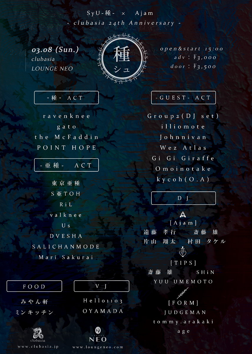 また、S亜TOHの所属するコレクティブ東京亜種が主催するパーティー「種 -SyU-」が3/8(日)に渋谷clubasia&渋谷LOUNGE NEOにて開催。