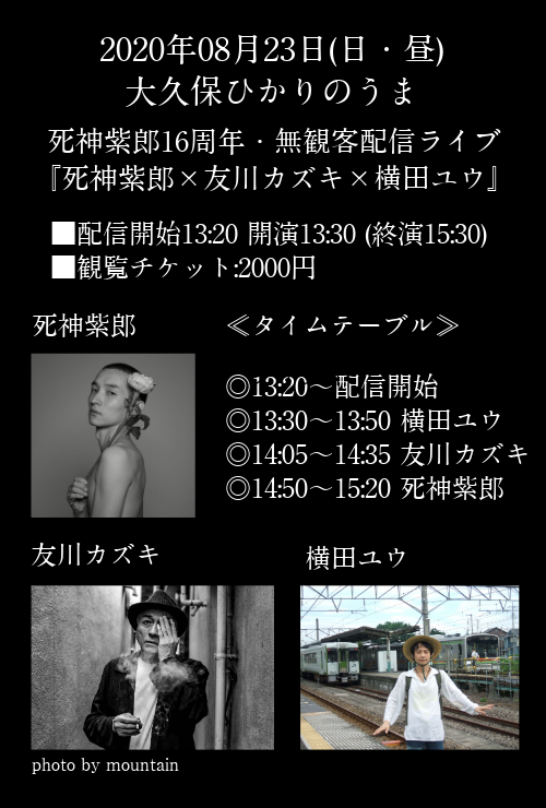 死神紫郎をはじめ、友川カズキ、横田ユウが出演するこのイベントは、twitcastingで配信される。