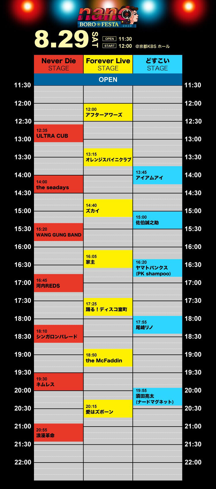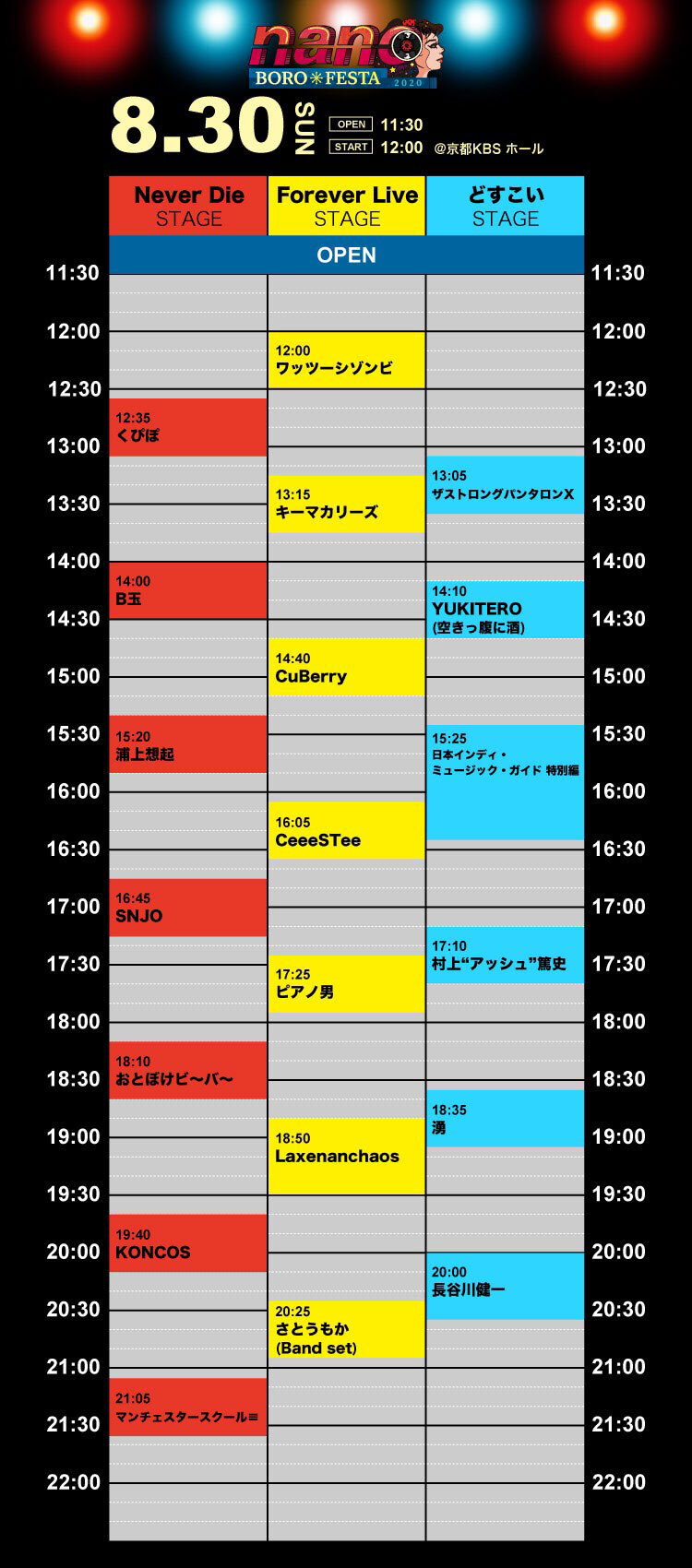 10月に開催を予定しているボロフェスタに先駆け8/29(土)30(日)に京都KBSホールにて開催される『ナノボロフェスタ2020』のタイムテーブルが発表された。