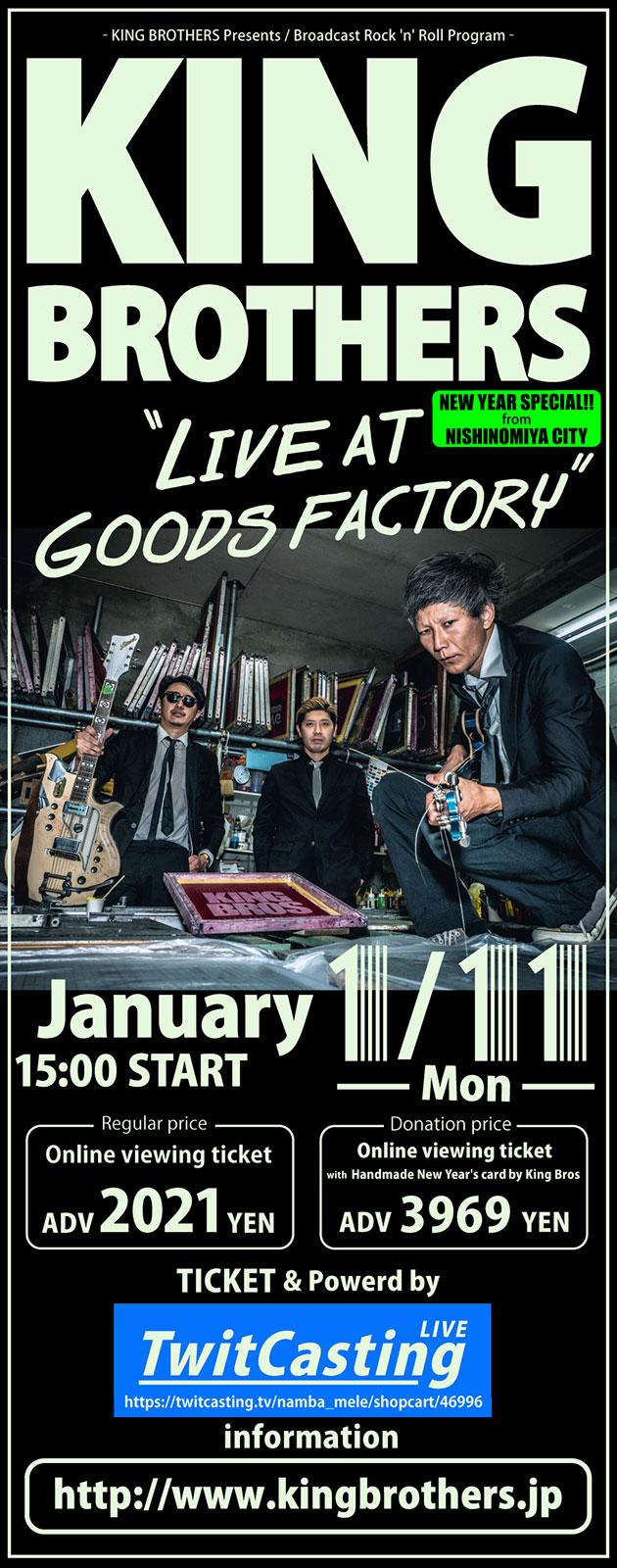 【NEWS】イベント情報:KING BROTHERS グッズ工場から配信されるストリーミングライブ『LIVE at GOODS FACTORY』開催決定
