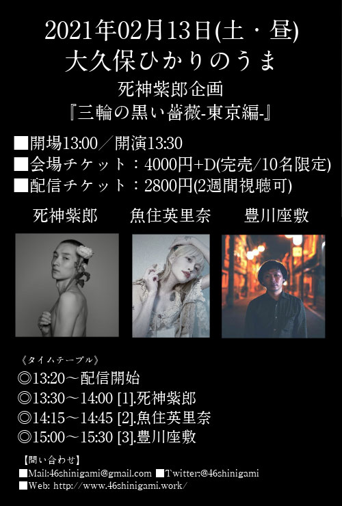 2/13(土)の東京編は、死神紫郎が東京の音楽と珈琲 ひかりのうまにて主催する10名限定の有観客+生配信ライブ。