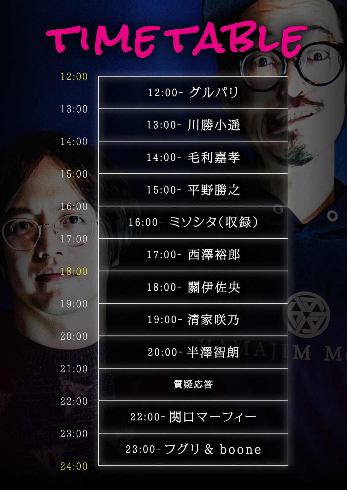 開催時間である12時間の中で1時間毎にゲストが入れ替わりで参加し、メインMC達と共に「場所」と「体験」をテーマにトークセッションが行われる予定。