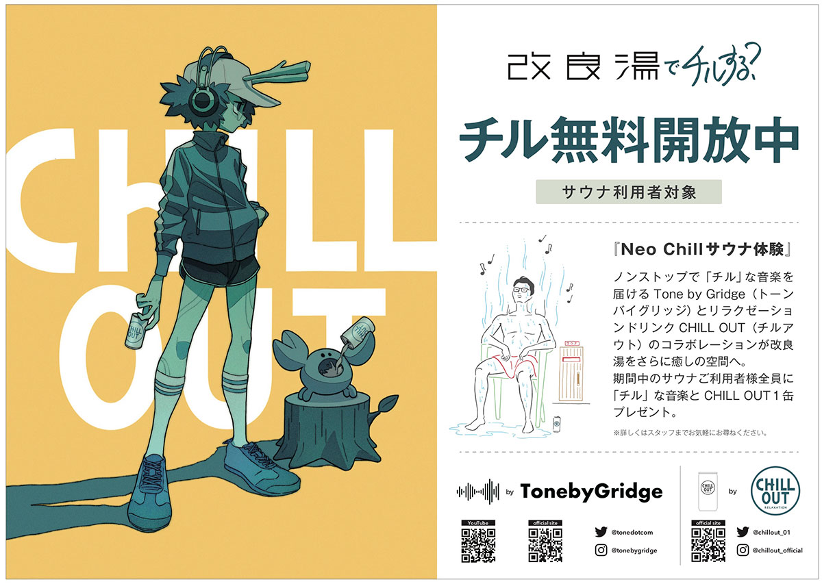 【NEWS】老舗銭湯 改良湯 × チルサウンドラジオ Tone by Gridge × リラクゼーションドリンク CHILL OUTによるトリプルコラボ「Neo Chillサウナ体験」期間限定で開催決定