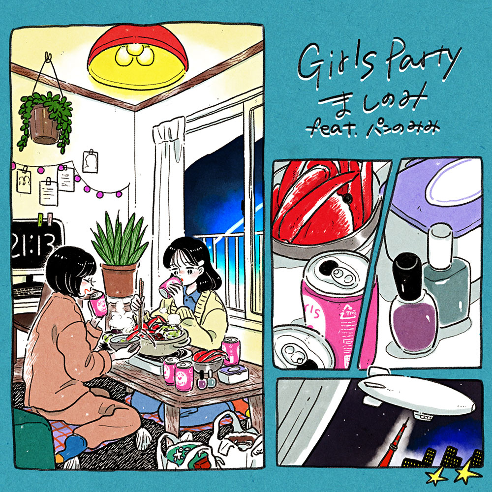 Girls Partyは、普段友達と話している時のように肩の力を抜いてリスナーの人に話しかけてみたくって作った曲です。心地よいゆらぎと軽さ、ほんのちょびっとの狂気を大切に仕上げました。ぜひ一緒にご飯を食べてるような気持ちで聴いてください。私はかなりの声フェチなので、彼女とどうしても一緒に歌いたかったんですよね。今回、コラボしたい!ってお互いなれてすごく嬉しかったです。むとうさん(パンのみみ)は一見ほわっとした雰囲気なのですが中身は結構スパイスが効いていておもしろいです。”格好悪いやつだけにはなりたくないよね”って、一緒に歌えて最高でした。