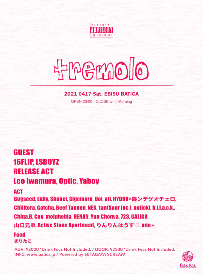 また、4/17(土)には恵比須BATICAにてOptic主催による共同リリースパーティー「TREMOLO」が行われる。ゲストアクトは16FlipとLSBOYZとなっている。