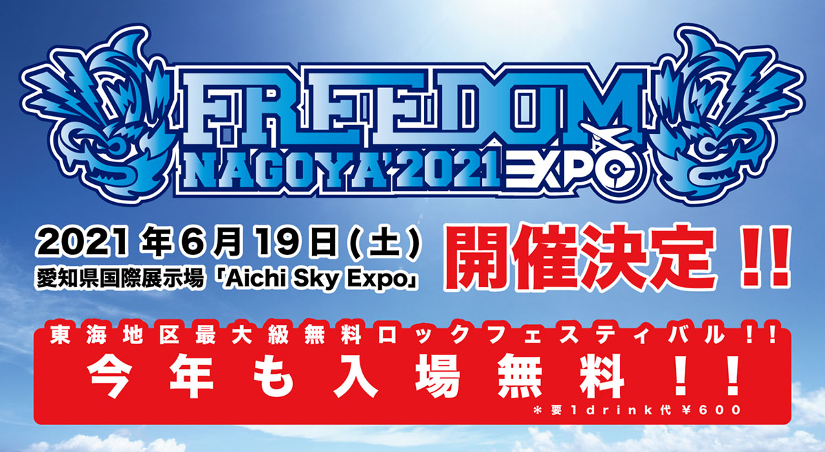東海地区最大規模の無料ロックフェスティバル『FREEDOM NAGOYA』が、今年は愛知県国際展示場「Aichi Sky Expo」に会場を変えて、6/19(土)に「FREEDOM NAGOYA 2021 -EXPO-」として開催する事を発表した。