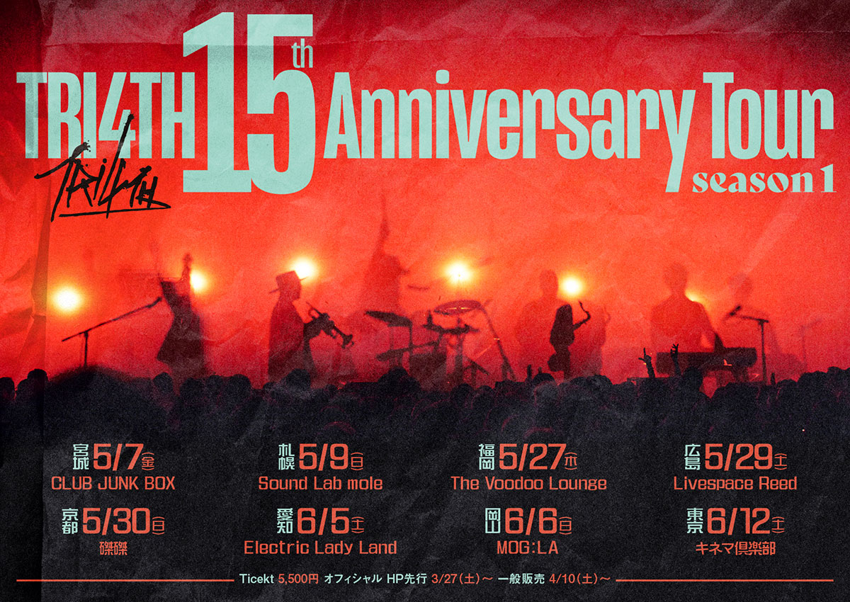 ジャズバンド TRI4THは、バンド結成15周年を記念したアニバーサリーツアー『TRI4TH 15th Anniversary Tour season1.』の開催を発表した。