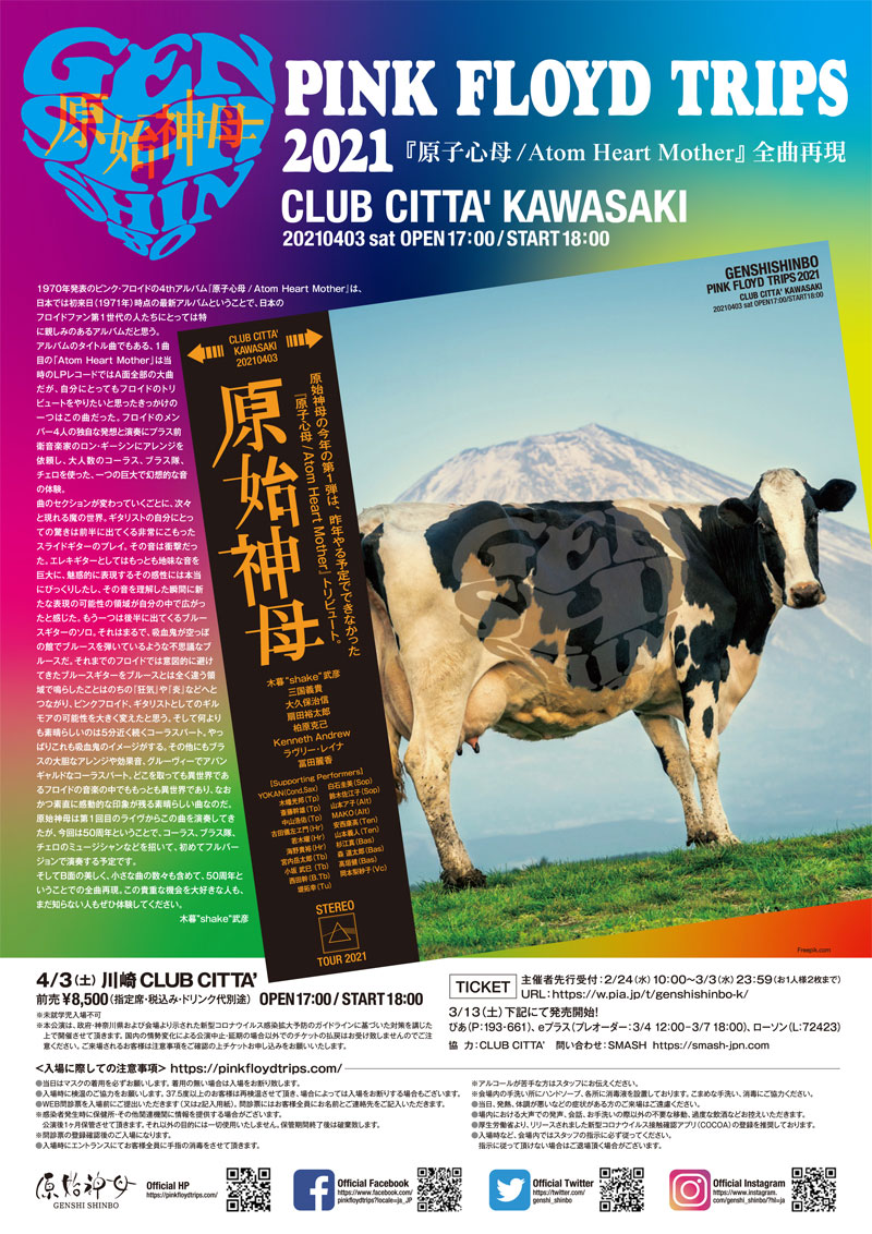 ピンクフロイド・トリビュートバンド 原始神母は、4/3(土)に川崎 CLUB CITTA’にて、「原始神母 〜PINK FLOYD TRIPS〜 2021『原子心母 / Atom Heart Mother』全曲再現」ライブの開催を発表した。